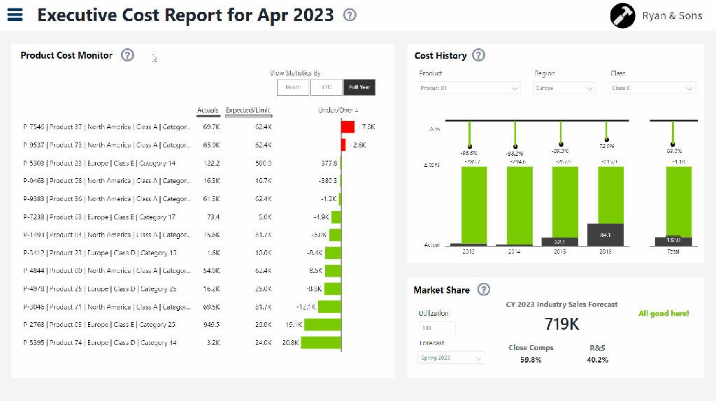 Ryan & Sons (R&S) is a major firm in the construction equipment supply industry, with manufacturing operations in both North America and Europe. To remain competitive, R&S executives needed a way of monitoring their major product manufacturing costs, and to keep tabs on their overall share of the market. R&S finance staff prepared monthly reports using data they culled from multiple systems. The process was cumbersome and inefficient.